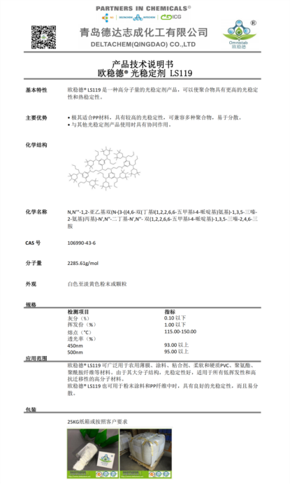 其中歐穩(wěn)德? LS119是一種非聚合性高分子量的受阻胺類光穩(wěn)定劑,能提高高分子材料光穩(wěn)定劑。
