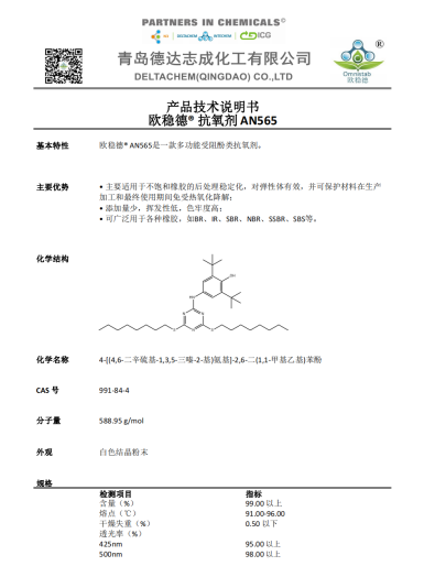 OMNISTAB? AN565就是一款高分子量的多功能受阻酚抗氧劑,具有相容性強(qiáng)、毒性低、色澤污染小的特點(diǎn),且自身兼具主、輔抗氧劑的雙重功效,能產(chǎn)生分子內(nèi)協(xié)同,又能與其他抗氧劑復(fù)配產(chǎn)生共混協(xié)同作用,抗氧化效果好。是多種樹脂優(yōu)良抗氧化劑和光熱穩(wěn)定劑。主要適用于不飽和橡膠的后加工穩(wěn)定處理,能保護(hù)材料在生產(chǎn),加工和最終使用過程中不發(fā)生熱氧化降解。