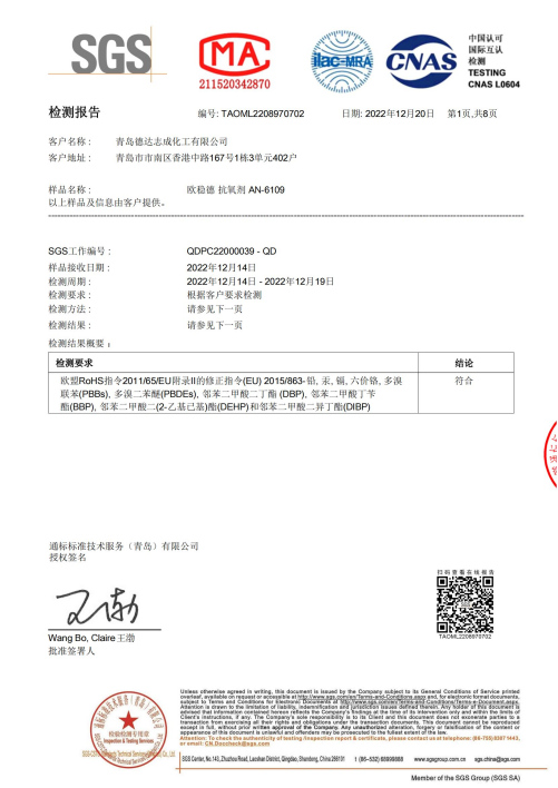 今年1月初我司聚氨酯抗氧劑歐穩(wěn)德 AN6109已順利通過了國際權(quán)威檢測和認(rèn)證機(jī)構(gòu)——SGS的RoHS第三方檢測認(rèn)證。