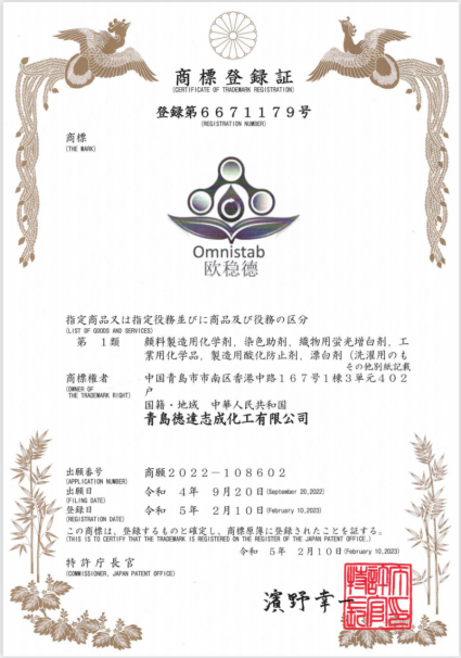 2023年2月10日,青島德達(dá)特化集團(tuán)順利完成“歐穩(wěn)德 OMNISTAB”商標(biāo)在日本地區(qū)的注冊(cè)。目前,商標(biāo)已通過(guò)日本當(dāng)?shù)厣虡?biāo)局核準(zhǔn),并成功獲得“日本商標(biāo)注冊(cè)證書(shū)”,證書(shū)有效期為2023年2月10日至2033年2月9日。