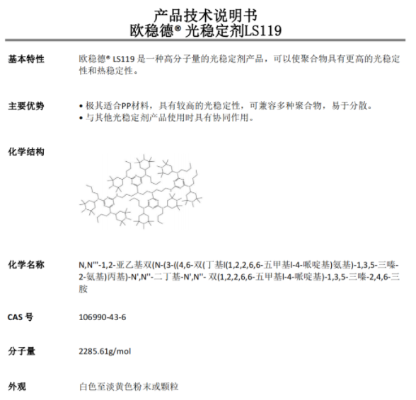 其中歐穩(wěn)德? LS119是一種非聚合性高分子量的受阻胺類光穩(wěn)定劑,能提高高分子材料光穩(wěn)定性。