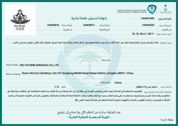 2023年11月20日,青島德達特化集團順利完成“歐穩(wěn)德 OMNISTAB”商標在沙特地區(qū)的注冊。目前,商標已通過沙特當?shù)厣虡司趾藴?,并成功獲得“商標注冊證書”,證書有效期為2023年4月2日至2032年12月13日。