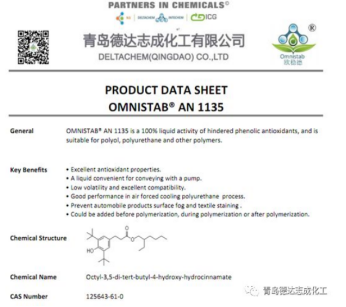 本品是適用于各種聚合物的性能優(yōu)異的抗氧劑。特別適用于聚氨酯軟泡沫膠板,可以防止多元醇在儲存過程中生成過氧化物,還可以防止在發(fā)泡過程中出現焦燒現象。由于低的揮發(fā)性和優(yōu)異的相容性,它在聚氨酯強制空氣冷卻過程中使用效果特別好。這一特性還可以防止在汽車上使用的制品表面起霧和紡織品的著色。本品既有優(yōu)異的抗氧化性能又有液體助劑可用泵輸送的方便性,便于使用且有效混合。在單一的液體、乳液、懸浮液、溶液或熔體聚合物制造加工方式下,1135 的低揮發(fā)性和液體狀態(tài)使之特別適用。易于乳化,在加工過程中加入可以溶解、分散或保持純液態(tài)??梢栽诰酆锨啊⒕酆线^程中和聚合后添加。AN1135 通常的推薦用量在0.15%和0.5%之間。