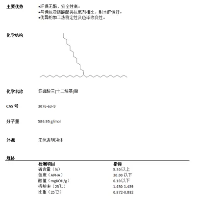 亞磷酸酯種類(lèi)有很多,包括二芳基酯、二烷基酯、二(烷基化芳基)酯、烷基芳基混合酯等。PVC配方中常用的亞磷酸酯主要有如下幾種:亞磷酸三苯酯( TPP)、亞磷酸二異癸酯 (PDDP)、亞磷酸三壬基苯基酯(TNPP)、雙酚A亞磷酸酯(1500)等等。