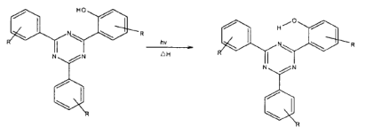 三嗪類(lèi)紫外線吸收劑與二苯甲酮類(lèi)和苯并三氮唑紫外線穩(wěn)定劑的穩(wěn)定機(jī)理相類(lèi)似,分子內(nèi)氫鍵發(fā)生破壞,形成下圖所示環(huán)狀互變異構(gòu)體: