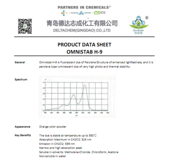 OMNISTAB H-9屬于熒光染料,其主要用途是光轉(zhuǎn)化的可能性,最大的吸收波長(zhǎng)為524nm,在氯仿中最大熒光波長(zhǎng)為539nm,轉(zhuǎn)換率高達(dá)90%。該染料可用于聚合物基體,如PC, PMMA, 環(huán)氧樹(shù)脂等,也可用做涂料添加劑。但是與PA、PU、聚烯烴不相容。基于其熒光特性,也可應(yīng)用于LED生產(chǎn),太陽(yáng)能聚光器等應(yīng)用中。OMNISTAB H-9在二氯甲烷、氯仿、丙酮中有極好的溶解性,同時(shí)具有良好的耐光性,適合各類(lèi)塑料、涂料、油墨、薄膜、防偽等產(chǎn)品的應(yīng)用。