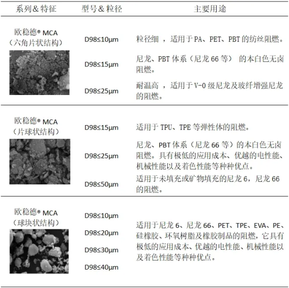 三聚氰胺氰尿酸鹽MCA阻燃劑阻燃性能與其晶體形態(tài)和粒徑有非常緊密的關(guān)系。經(jīng)過產(chǎn)線升級,我司目前可以生產(chǎn)三種不同晶型的MCA產(chǎn)品,同時每種晶型對應(yīng)不同粒徑的產(chǎn)品,滿足更多客戶不同應(yīng)用場景。