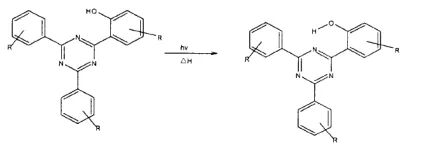 三嗪類紫外線吸收劑與二苯甲酮類和苯并三氮唑紫外線穩(wěn)定劑的穩(wěn)定機理相類似,分子內(nèi)氫鍵發(fā)生破壞,形成下圖所示環(huán)狀互變異構(gòu)體:
