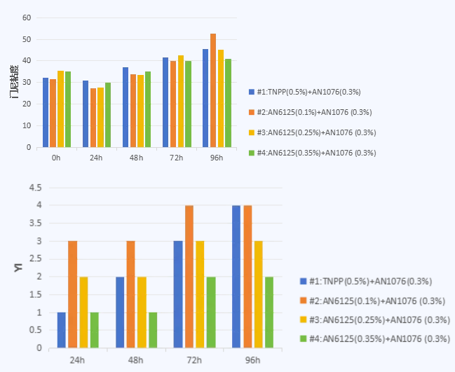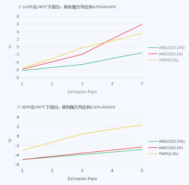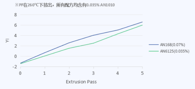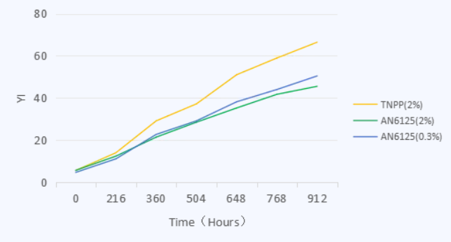2、在更低用量下,AN6125為聚烯烴材料提供更優(yōu)異的顏色穩(wěn)定性