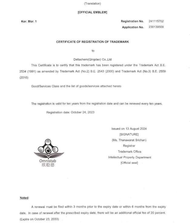 近日,青島德達特化集團順利完成“歐穩(wěn)德 OMNISTAB”商標在泰國地區(qū)的注冊。目前,商標已通過泰國當?shù)厣虡司趾藴?,并成功獲得“商標注冊證書”,證書有效期為2024年10月24日至2033年10月23日。