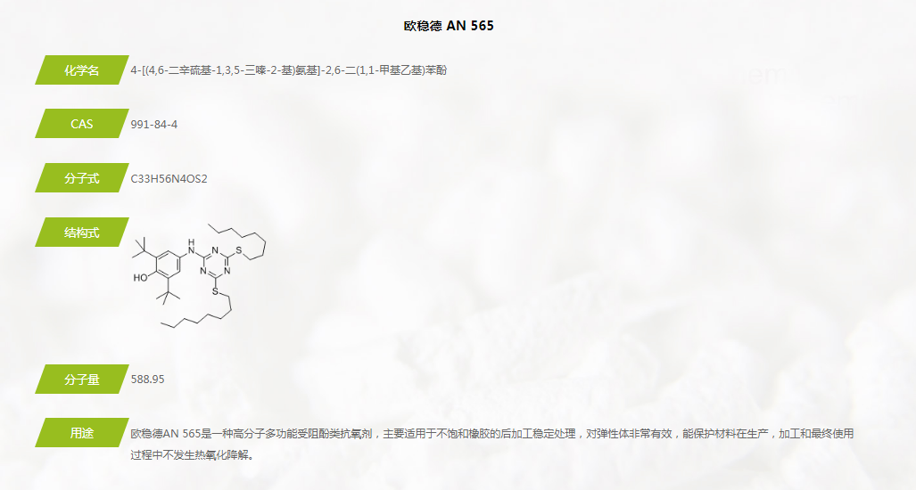 OMNISTAB? AN565 is a high molecular weight multifunctional hindered phenolic antioxidant. It is mainly suitable for post-processing and stable treatment of unsaturated rubber. It can protect them aterial from thermal oxidative degradation during production, processing and final use. OMNISTAB? AN565 has a small addition amount, low volatility, high color fastness, and it can prevent the formation of gel.