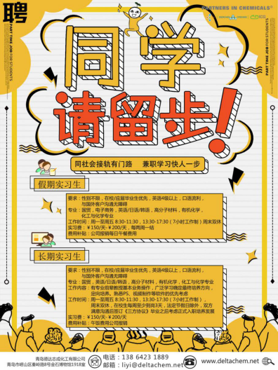 目前PARTNERS IN CHEMICALS的分支機(jī)構(gòu)已經(jīng)分布于歐洲、中東、北美、中國(guó)大陸和香港地區(qū),其品牌歐穩(wěn)德Omnistab已成為具有世界影響力的聚合物添加劑品牌。由于本公司需繼續(xù)擴(kuò)大業(yè)務(wù),提升品牌知名度以及市場(chǎng)份額,針對(duì)國(guó)家法定節(jié)假日、寒暑假旺季時(shí)間,現(xiàn)特面向?qū)W校招聘假期實(shí)習(xí)生、長(zhǎng)期實(shí)習(xí)生。