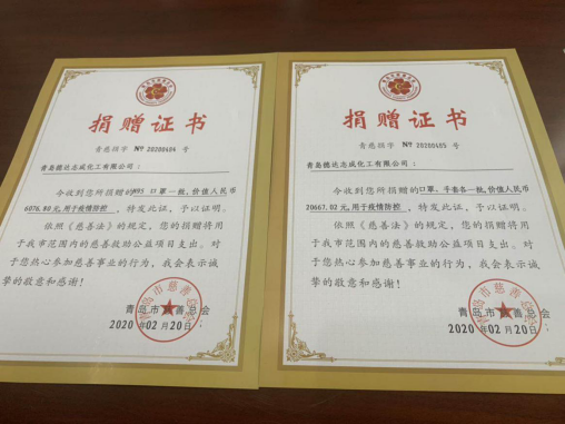 青島德達(dá)志成化工有限公司作為一個(gè)富有社會(huì)責(zé)任感的公司,時(shí)刻關(guān)注疫情進(jìn)展。我司位于以色列、迪拜等地辦公室的同事在中國疫情擴(kuò)散期間積極聯(lián)系當(dāng)?shù)胤雷o(hù)用品購買渠道,并采購寄往中國青島辦公室,希望能夠幫助中國扼制病毒的擴(kuò)散。