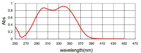 UV 571在300-400nm紫外區(qū)內(nèi)有強(qiáng)吸收,而在大于400nm的可見光區(qū)內(nèi)吸收非常小,其在氯仿溶液中的最大吸收峰在303nm和343nm。