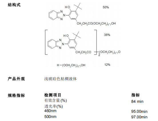 OMNISTAB UV1130是液態(tài)鄰羥基苯并三唑UV吸收劑的代表產(chǎn)品,UV 1130是一個混合產(chǎn)物,其中有50%乙二醇單酯化產(chǎn)物,38%的乙二醇雙酯化產(chǎn)物,12%的沒有反應的聚乙二醇,由于該產(chǎn)品中含有大量的羥基能與汽車面漆樹脂中的氨基作用,從而提高穩(wěn)定效果。它具有良好的抗高溫和抗萃取特性,特別適用于較高耐候性要求的工業(yè)和汽車涂料領域,還可以提供給諸如木器類敏感基質足夠的保護。