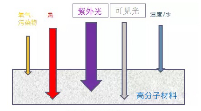 空氣中的氧氣和陽光中的紫外光導(dǎo)致塑料材料發(fā)生熱氧化和光氧化反應(yīng),使塑料制品的外觀和物理力學(xué)性能變差,提前失去原有功能和使用價(jià)值。主要的原因是光引起的自由基反應(yīng)、化學(xué)鍵變化、鏈?zhǔn)椒磻?yīng)、自催化等過程,從而使分子鏈斷裂、交聯(lián)等,特別是在不定型態(tài)區(qū)域,以斷鏈等形式老化降解,這種效果一旦啟動(dòng),如不制止,將以幾何倍數(shù)加速。表面最為明顯,但也會(huì)逐漸涉及到內(nèi)部。