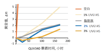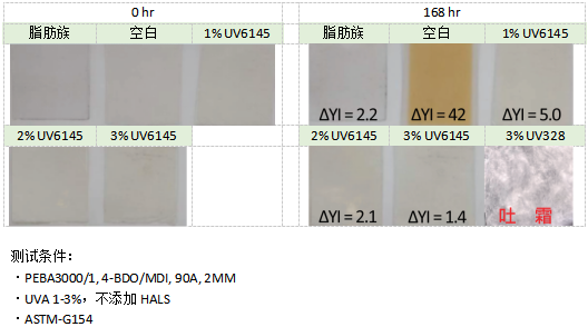圖1中,添加了2% UV6145的芳香族TPU(MDI base)與脂肪族TPU同時(shí)進(jìn)行QUV340光老化168小時(shí)后,含UV6145的TPU達(dá)到與脂肪族TPU相同的耐黃變表現(xiàn)。