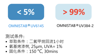 當(dāng)應(yīng)用于胺基烤漆時(shí),如圖3所示,UV6145反應(yīng)到涂料高分子主鏈中,使其具有不遷移特性與優(yōu)異的耐溶劑萃取性,測試中UV6145的溶劑萃取率低于5%,而一般添加劑型UVA則超過99%都被萃取出涂層。