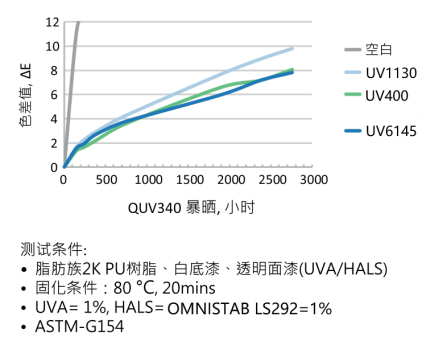 當(dāng)面對更高要求的長時(shí)間戶外耐候暴曬時(shí),UV6145與反應(yīng)性N-OR受阻胺光穩(wěn)定劑(LS152)或聚合型受阻胺光穩(wěn)定劑LS3346搭配使用時(shí),可產(chǎn)生高效的協(xié)同作用,達(dá)到長時(shí)間耐黃變要求,如圖2所示。