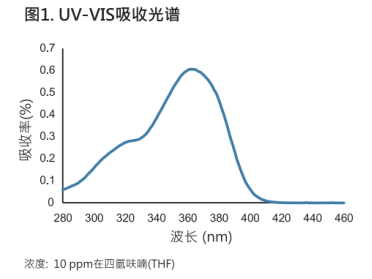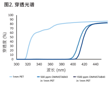 如圖1所示,OMNISTAB BR 43在UV-A波段具有非常高的吸收率。因此,在1 mm 厚的PET膜中添加1500 ppm時,OMNISTAB BR 43可完全遮蔽掉波長405 nm 以下的光線(如圖2所示)。以藍(lán)光吸收應(yīng)用來看﹐此適切的光學(xué)遮蔽特性也降低OMNISTAB BR 43對初始色的影響,使產(chǎn)品能同時兼顧光學(xué)性能與外觀。