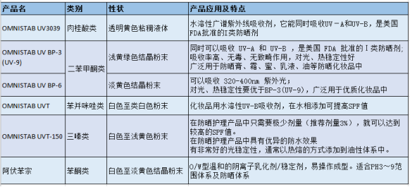 除OMNISTAB UV BP6 外,我司還有一系列可應(yīng)用于不同化妝品體系中的UV吸收劑如下: