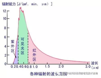 我們都知道,從太陽(yáng)發(fā)射出來(lái)的輻射線,其電磁波是非常寬的,能夠到達(dá)地面的主要包括紫外線、可見(jiàn)光和紅外線等。輻射線的能量與波長(zhǎng)成反比,波長(zhǎng)越短,能量越大。其中290nm-400nm波長(zhǎng)范圍內(nèi)的紫外線,波長(zhǎng)最短,能量也最高,其對(duì)塑料等聚合物的破壞性也最大,有機(jī)聚合物的鍵能通常在290~400kJ/mol范圍內(nèi),故很容易為紫外線所破壞。因此,紫外線是影響塑料光老化的主要因素。但要注意的是不同結(jié)構(gòu)的高分子化合物對(duì)紫外線各種不同長(zhǎng)短波段的敏感程度是不一樣的。