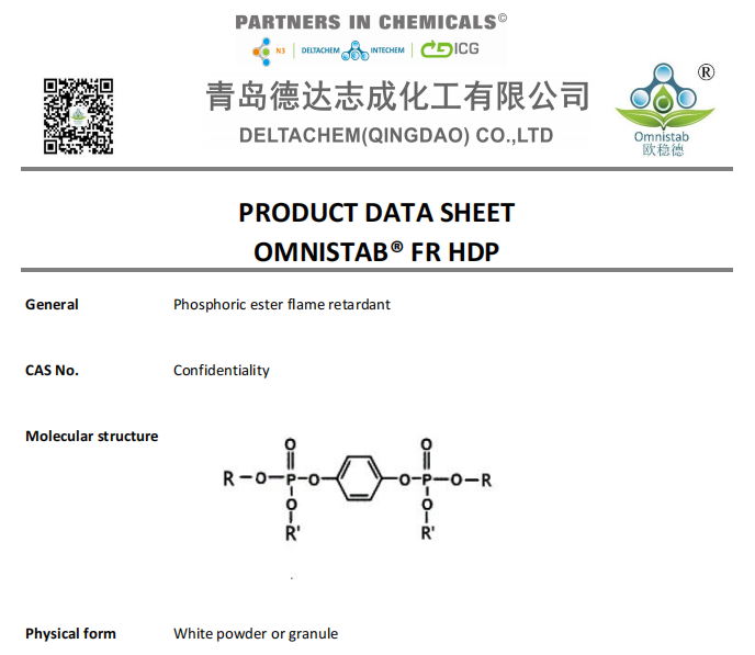 青島德達志成化工有限公司順應市場和客戶的要求,始終將新阻燃劑產(chǎn)品的研發(fā)重心放在綠色環(huán)保上,并持續(xù)推出多款新型無鹵環(huán)保阻燃劑。OMNISTAB FR HDP是近期推出的一款無鹵磷酸酯類阻燃劑,具有較低的揮發(fā)性和優(yōu)異的熱穩(wěn)定性,可滿足工程塑料的加工需求。能有效的應用于PP,PC,PET,ABS, PPO,HIPS,TPU等材料中。