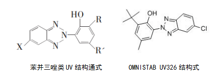 OMNISTAB UV326分子結(jié)構(gòu)中X為Cl取代基,3’-位為叔丁基和5’-為甲基的結(jié)構(gòu)不但能引起透射光譜紅移,而且摩爾消光系數(shù)增大了,使其紫外線吸收效率提高。而且在波長400 nm顯示較陡的吸收邊緣,對400nm以上的可見光幾乎不吸收,對被保護(hù)的高分子材料顏色影響,較羥基二苯甲酮類紫外線吸收劑類小,故UV326也適用于透明塑料制品。