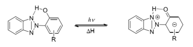 苯并三唑類紫外線吸收劑的作用機(jī)理與二苯甲酮類相似,其結(jié)構(gòu)中,也存在著分子內(nèi)氫鍵鰲合環(huán)(由羥基與三唑基上的氮所形成),當(dāng)吸收紫外光后,氫鍵斷裂或形成光互變異構(gòu)體,把有害的紫外光能轉(zhuǎn)變成無害的熱能而釋放。